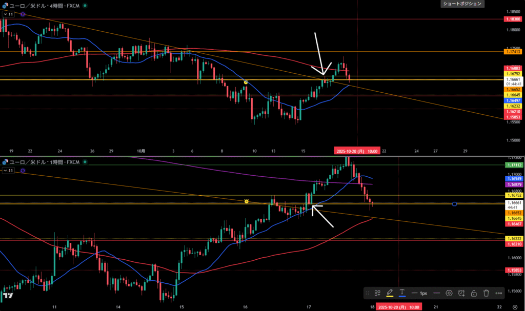 黄色線より上に4時間足の戻り売り勢力が居る。