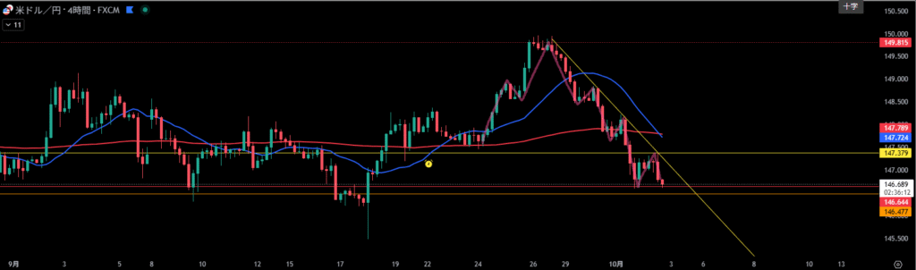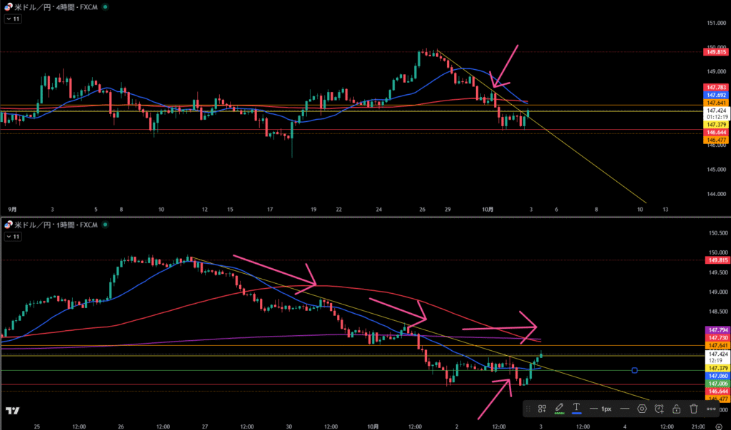 日足下落の波の途中は4時間足下落トレンドを追いかける。