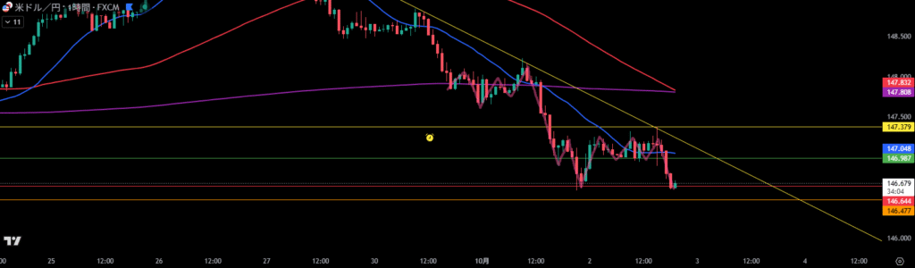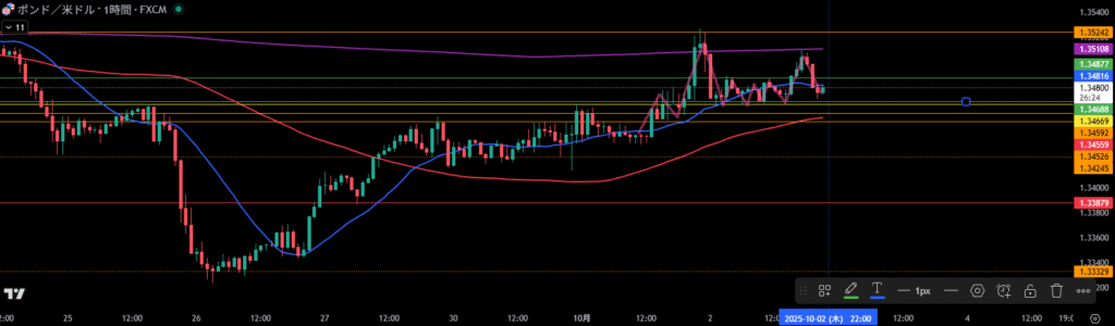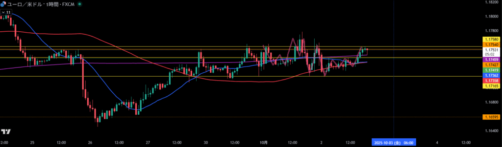 移動平均線は1時間足の売り抑えとして機能しやすい。が今は水平向き。