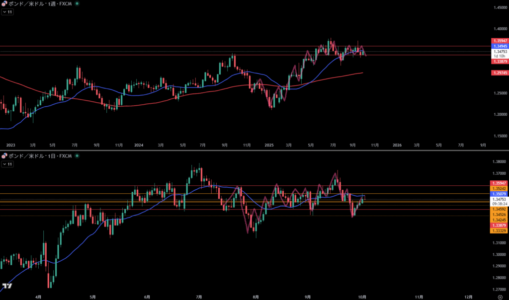 赤点線は週足の目標値ライン。として機能するか観察する。レジスタンスとして強い感覚は無い。