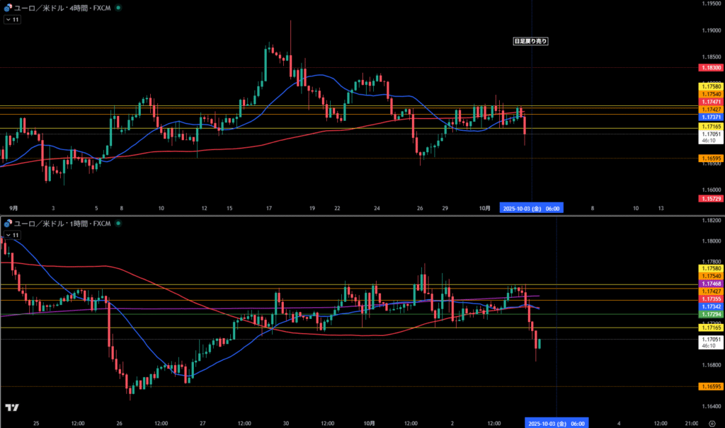 金曜あたりに4時間足のボックスから1時間足の戻り売りで入っていくという目線も頭に片隅に入れておく。