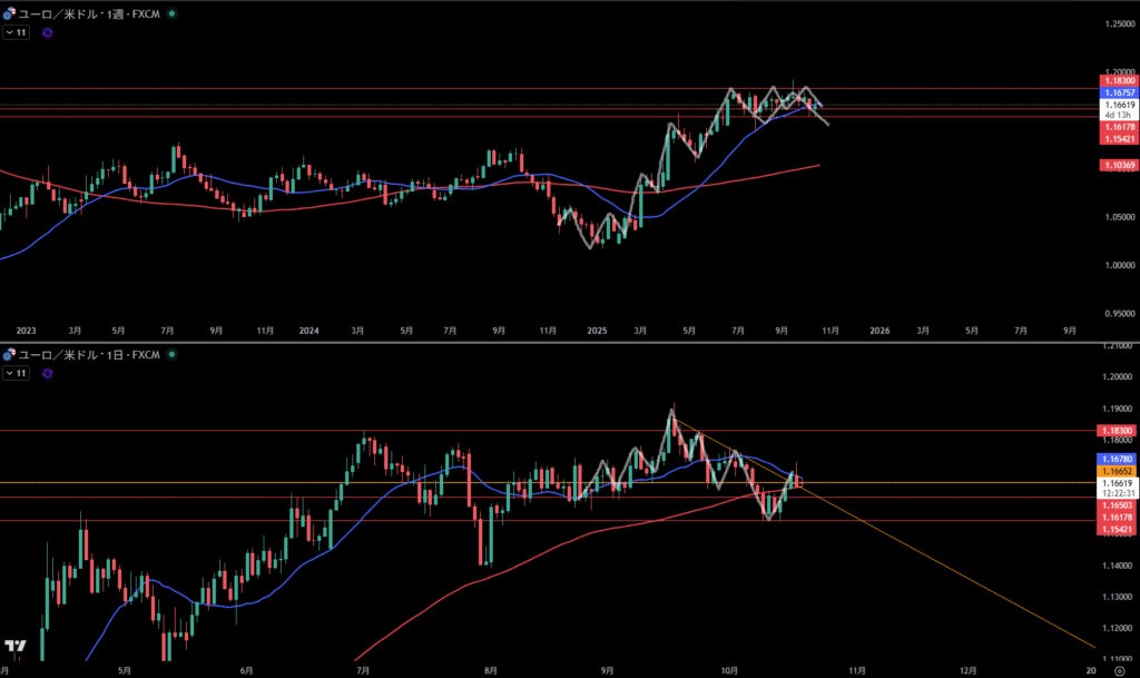 週足方向は下。ただ直近安値を割っているか明確ではないので分からない。