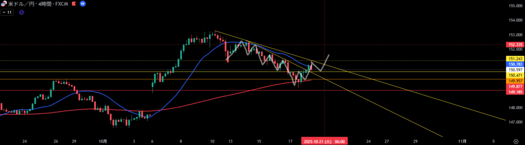 黄色線より下に4時間足の押し目買い勢力が居る。がそこまで押すと移動平均線と交差する。