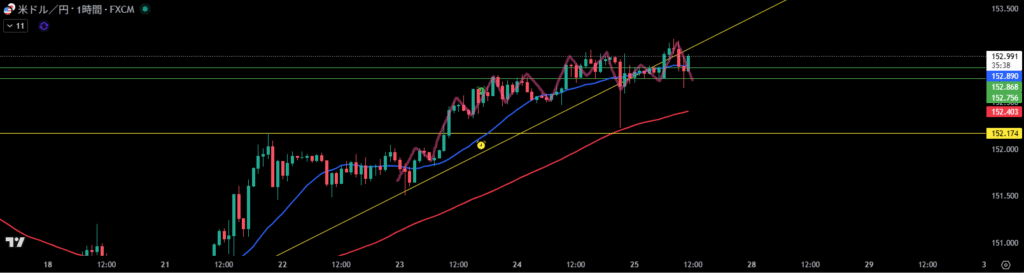 日足の二番目が来るなら、米国時間に4時間足押し目買いか、ただし日足の移動平均線が効いているのが4時間足1時間足の上髭から想像できるので、日足の移動平均線の傾きが横向きになり、1時間足のエントリー価格もしくは4時間足の押し目買いライン付近まで押してくるかして、リスクリワードがとれるならエントリーを検討する、日足移動平均線を抜けていくかマジで見る。
