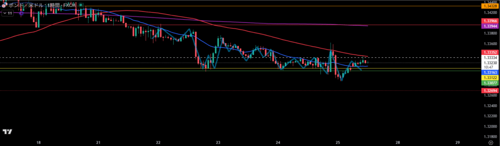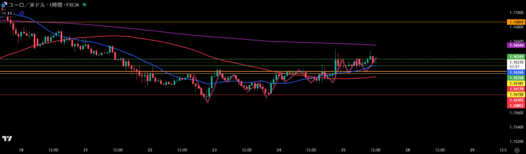 移動平均線は1時間足の買い支えとして機能しやすい。が角度は水平になって来たか。