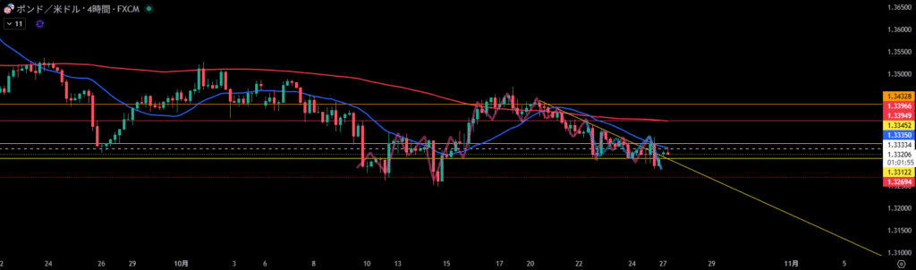 4時間足方向は下。