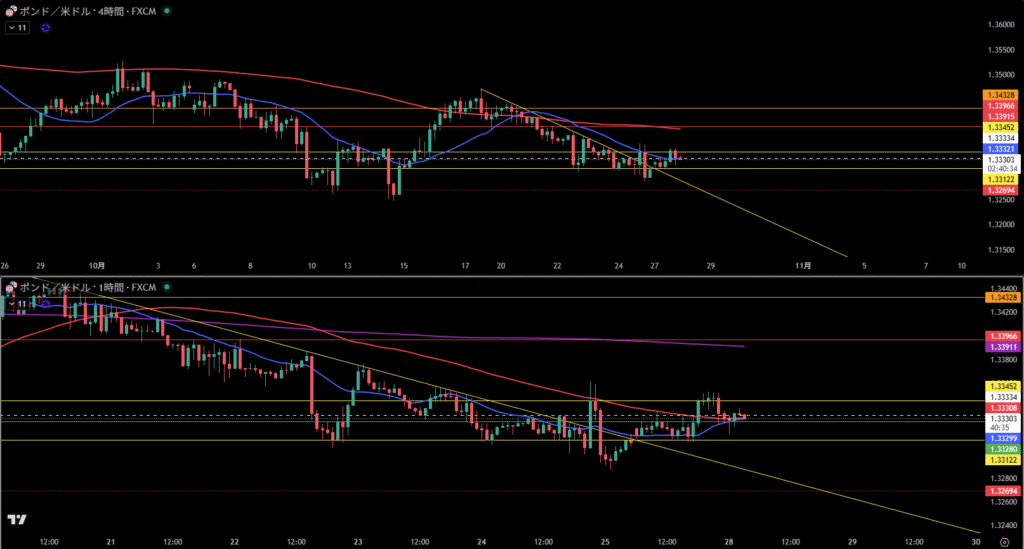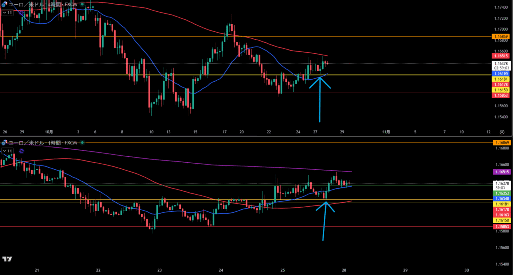 むしろ4時間足の下降トレンドライン抜けを狙う方がしっくりくる。ただしエントリーしても、4時間足の売り抑えラインも無視できない。