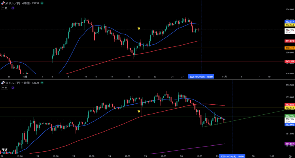 米国時間に4時間足押し目買いを検討するが、進行方向に日足の移動平均線があるのでリスクリワードを見ていきたい。ただ超えていきそうだなっ感覚はある。