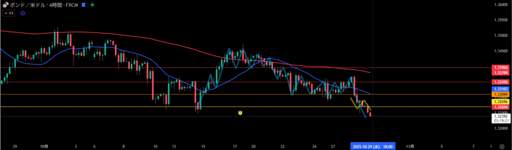 黄色線より下に4時間足の押し目買い勢力が居る。と思ったが、波が出てしまって買い支えラインを割って下落の波の途中か。