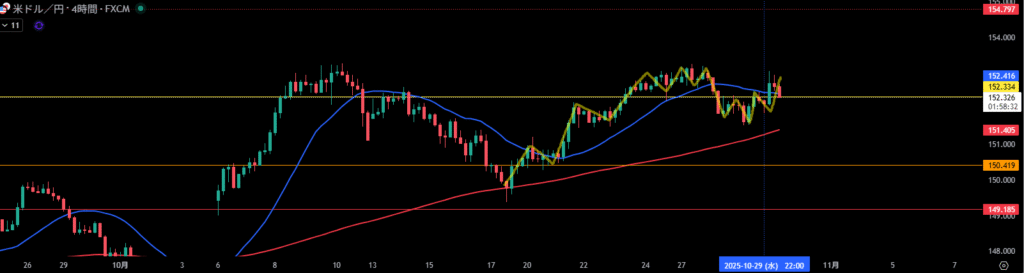 米国時間に、4時間足押し目買いを検討するが移動平均線が下向きなので乗っかった確認を待ちたい。