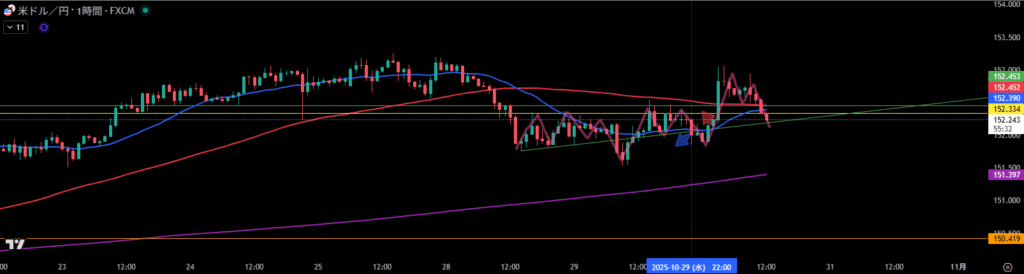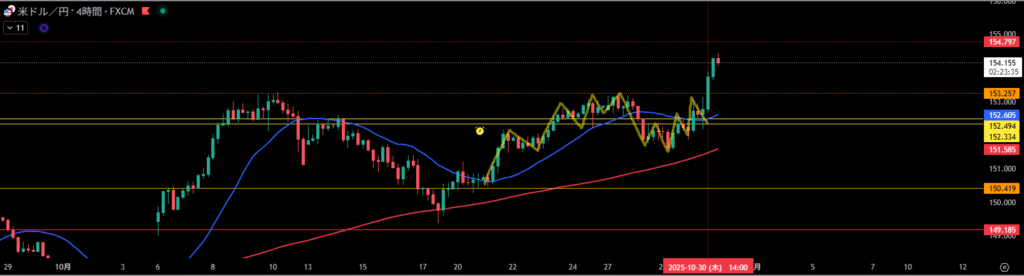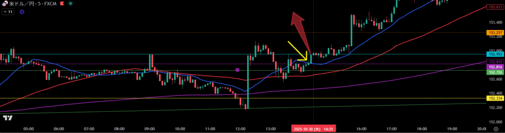 4時間足は波のサイズ感的に足が早い波で進んでいたので、4時間足押し目買いラインに支えられ、4時間足移動平均線に乗っかってくれば、4時間足の波が出ると感じていた。
