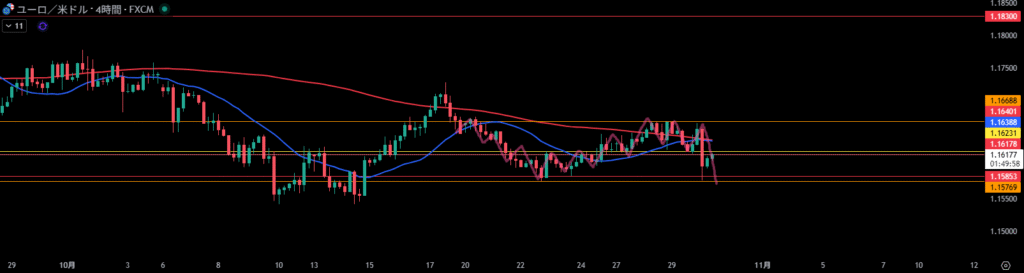 移動平均線は4時間足の買い支えとして機能しやすい。が下向きで交差している。