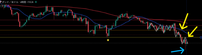 黄色矢印で4時間足押し目買いラインを確認し、4時間足移動平均線にも乗っかって来た。