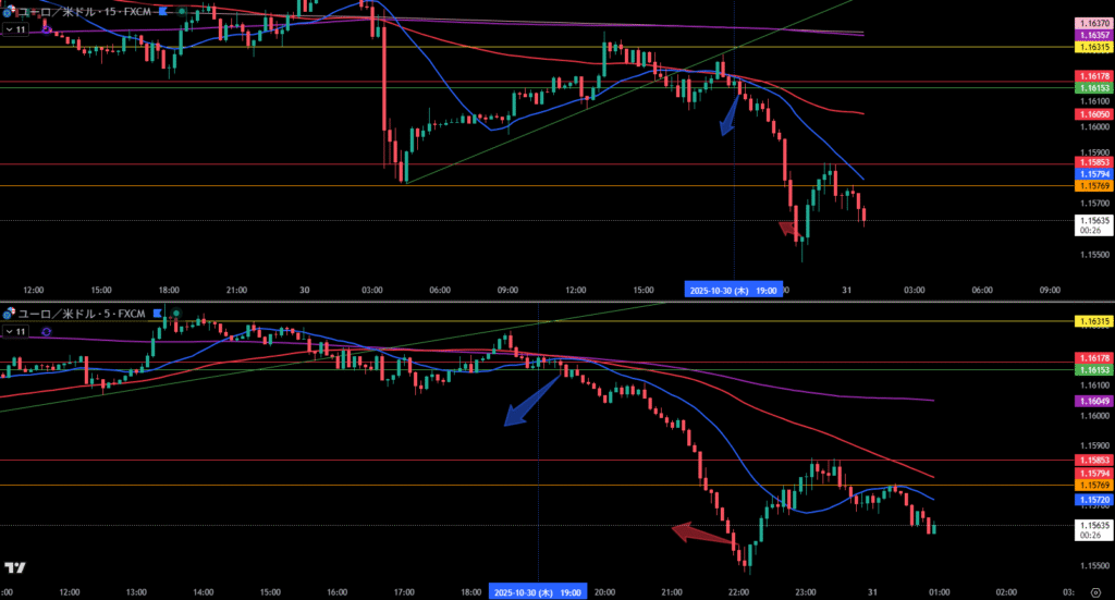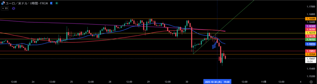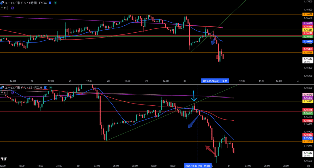 水色矢印で1時間足の斜めで確認され、上には行きませんっていう相場の意志を感じる、その後の1時間足割れでエントリー。