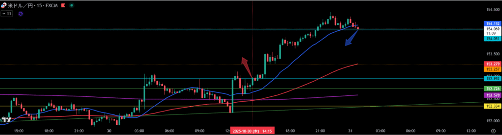 1時間足押し目買いラインや移動平均線があれば分割で耐えるのだが、大きく上昇したので15分ダウで全決済した。