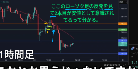 塾長は1本目の安値が1時間足安値として意識されているって思って、黄色矢印の1時間足安値抜けからエントリーした。
