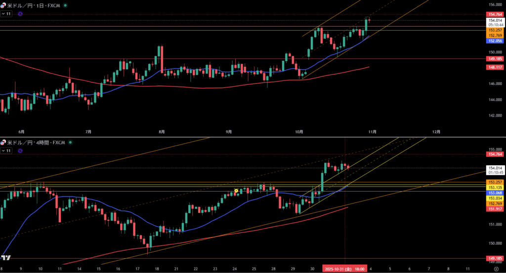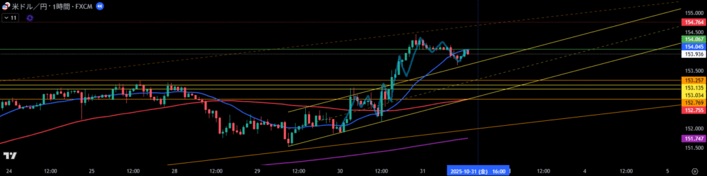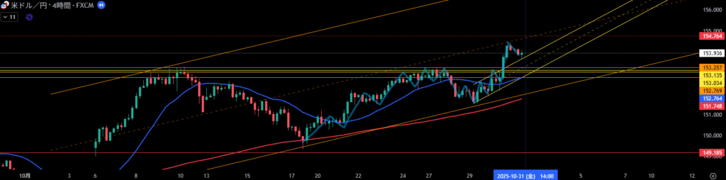 逆に4時間足チャネル上限に支えられるようであれば、1時間足押し目買いの形で入っていくか。