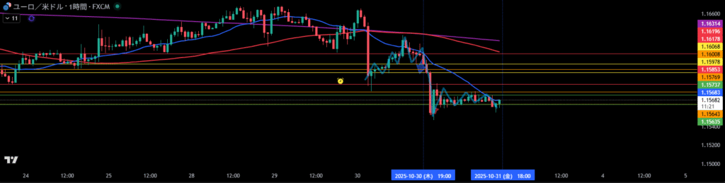 移動平均線は1時間足の売り抑えとして機能しやすい。が方向は上向きで売り抑えとしては弱い。