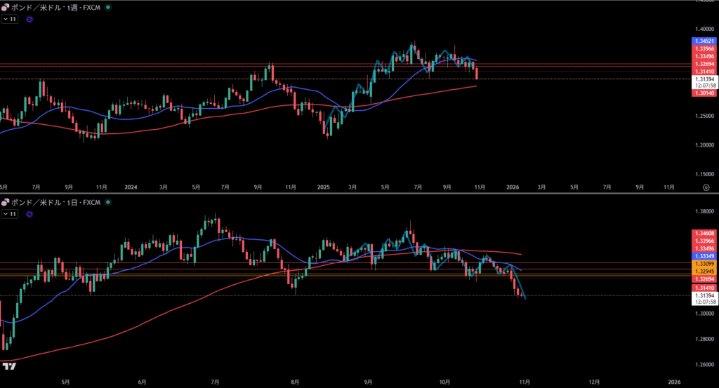 日足の気になる直近安値は気にしておく。反発するなら分割決済で対応する。