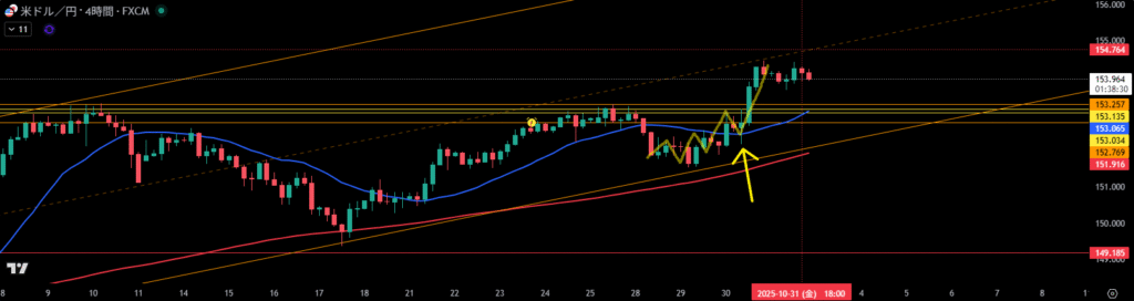 昨日黄色矢印で、4時間足の押し目買いを狙って行ったが、日銀の政策金利だったみたい、つまりエントリーしなくても良い場所だった。