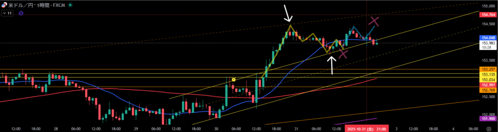軸足のトレンドラインのチャネルラインにレジサポの下位足押し目買いや、センターラインを目標値にするのは、難易度高すぎって思った、封印しよう。