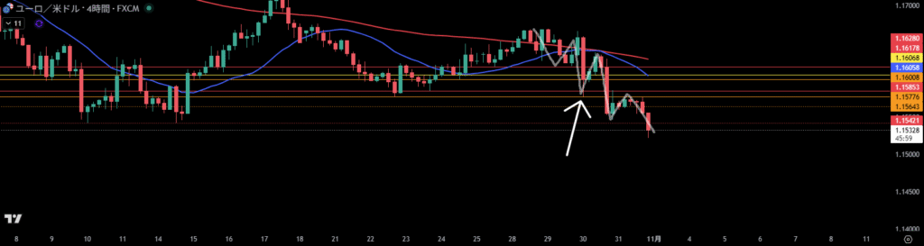 反省としては、このヒゲ先に4時間足の戻り売りラインを引いてなかったことだ、移動平均線と乖離しているが、4時間足の波のサイズ感的に戻り売りは問題なしだよな。