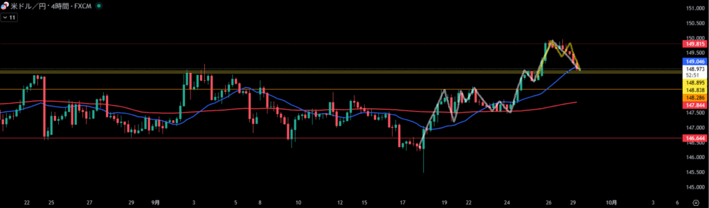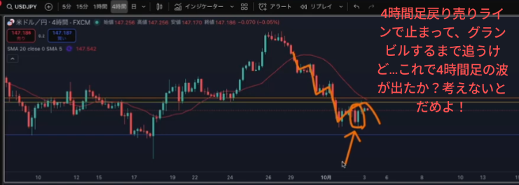塾長はヒゲとは言え4時間足は抜けたと見て米国時間で4時間足戻り売りの目線もあるって言ってた。