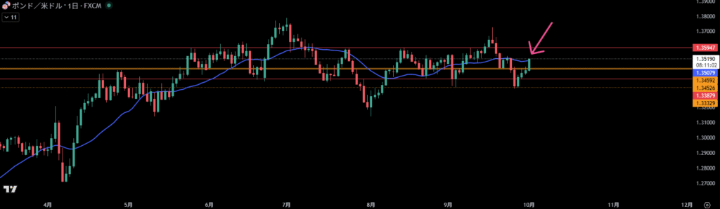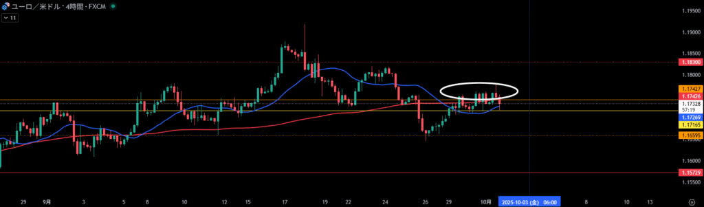 日足戻り売りライン真上だったから、4時間足はトレンド発生シグナルと見るのがしっくりくる。
