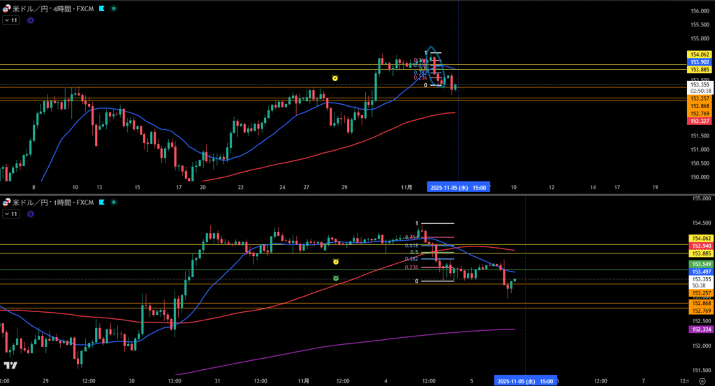 戻ってきてくれれば引き続き4時間足戻り売りを狙えるが、日足押し目買いライン真上の可能性もあるので、4時間足の波が出てしまった判定とリスクリワードは注視したい。