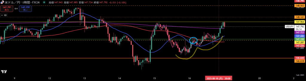 移動平均線は1時間足の買い支えとして機能しやすい。