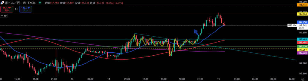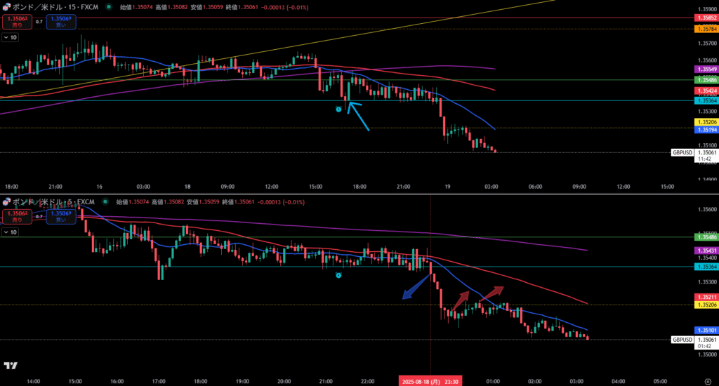 矢印の資金が入ってきたこのローソク足が15分足の買い支え最前線と予測し5分足でドンと割ってきたところでエントリーした。