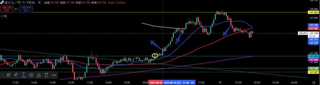 今回は安パイに水平抜けでエントリーしたが、5分足確定見てたらエントリーが遅れた、黄色マルがベストポイントだけど、エントリーしたことが素晴らしい!。