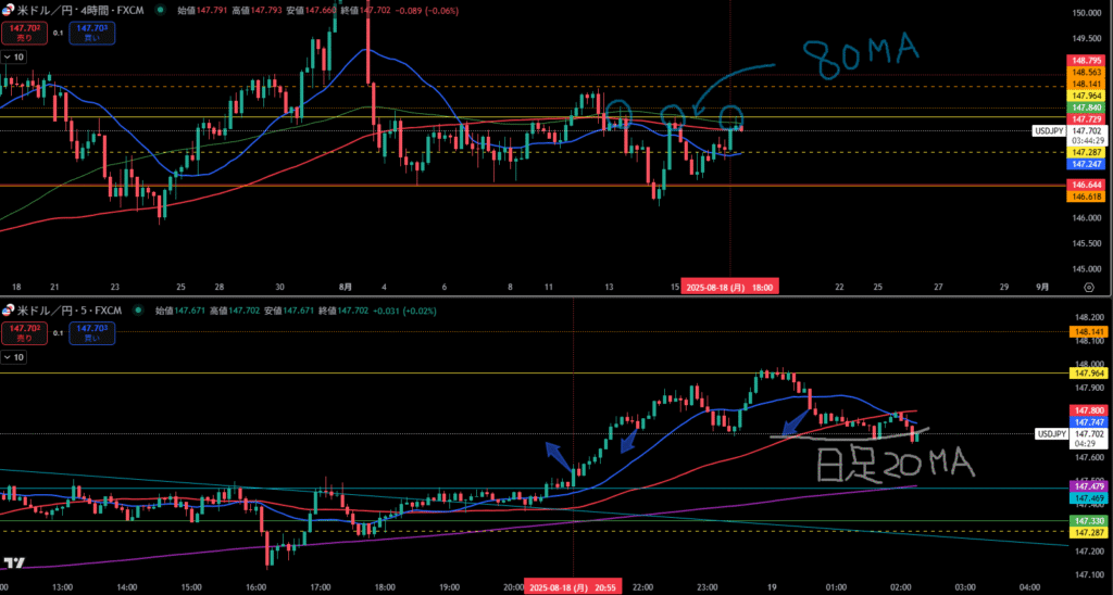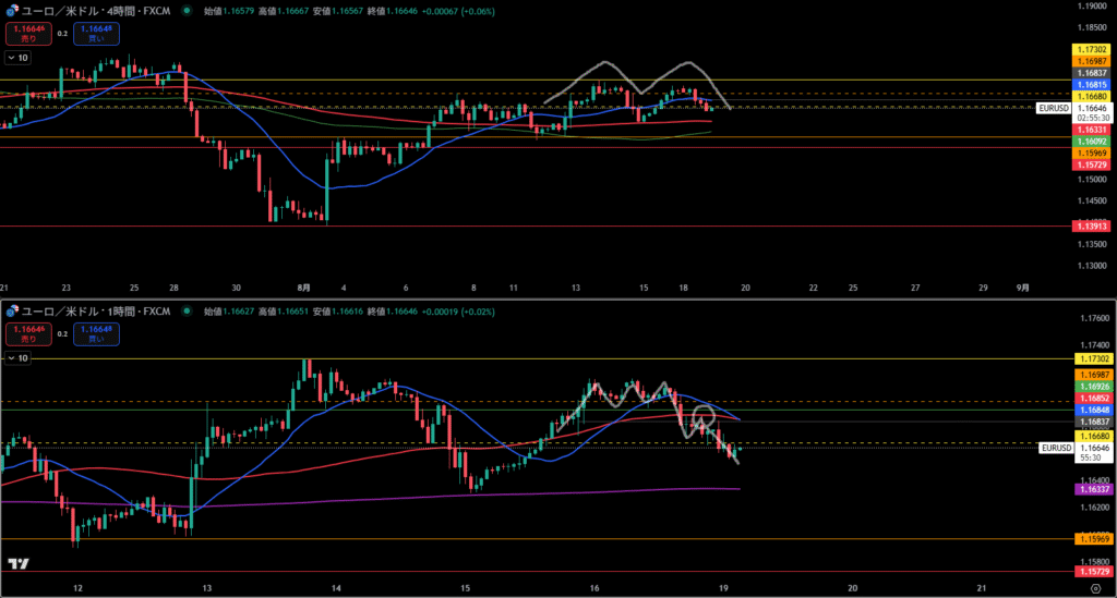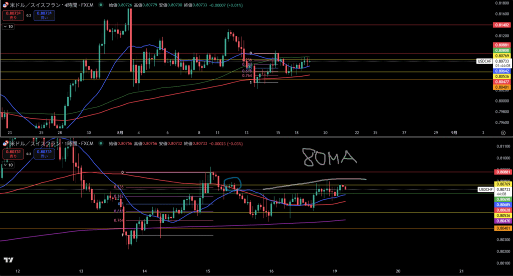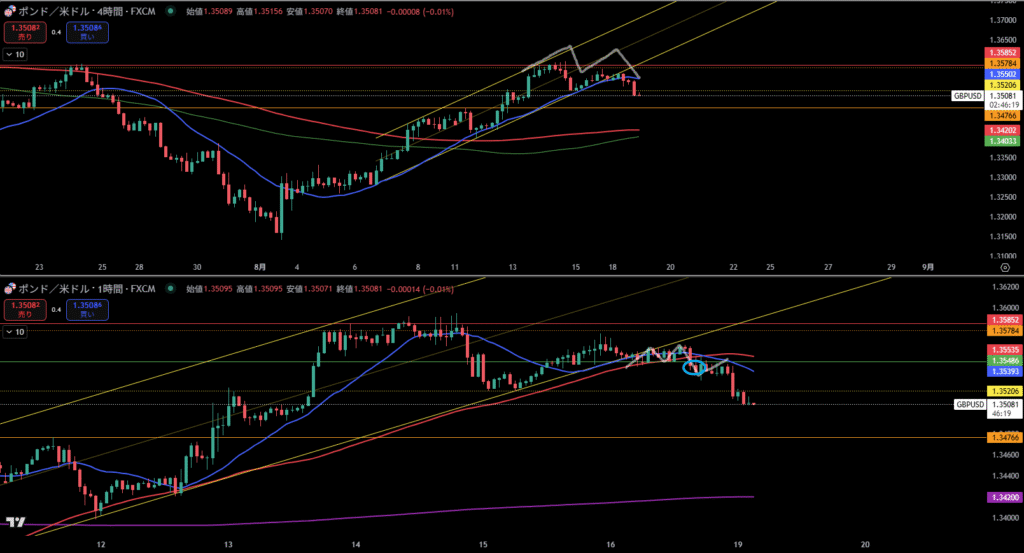 4時間足全戻しセオリーを考えるが、4時間足MA的にきな臭い。