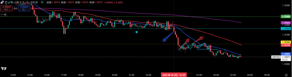 日足売り抑えで4時間足の二番目で1時間足の戻り売りか、しかし1時間足戻り売りラインに到達してないし、4時間足の戻し過ぎの黄色点線が見えてたから入りにくいから、僕の獲物ではない。