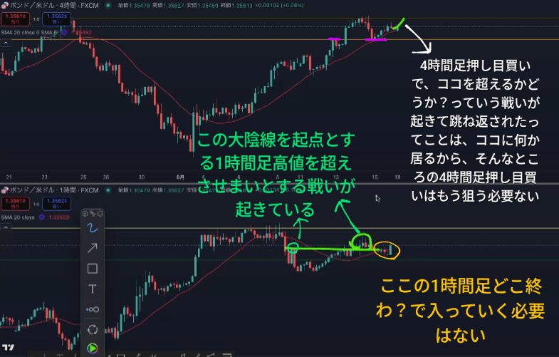 • 『4時間足押し目買いの波が伸びていく』って感じた時の(日足の波が明確に来ていて、1時間足MAが上向き)4時間足押し目買いの波を縦に追う技(4時間足・1時間足押し買いになってない)、1時間足どこ終わ?15分足高値越えでエントリーする。(4時間足押し目買いの波を縦に追っているという意識が重要)