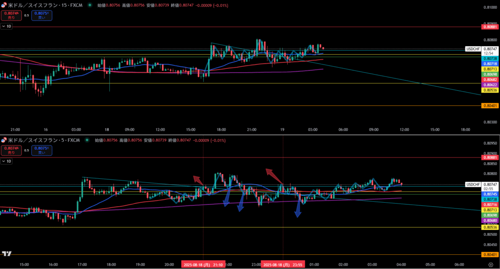 1時間足準備おK、15分足準備おKなので5分足高値越えでエントリーするが伸びず