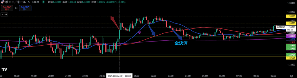 1時40分に4時間足の節目ラインで5分足MAを割ったので心を軽くするために1/4決済した。