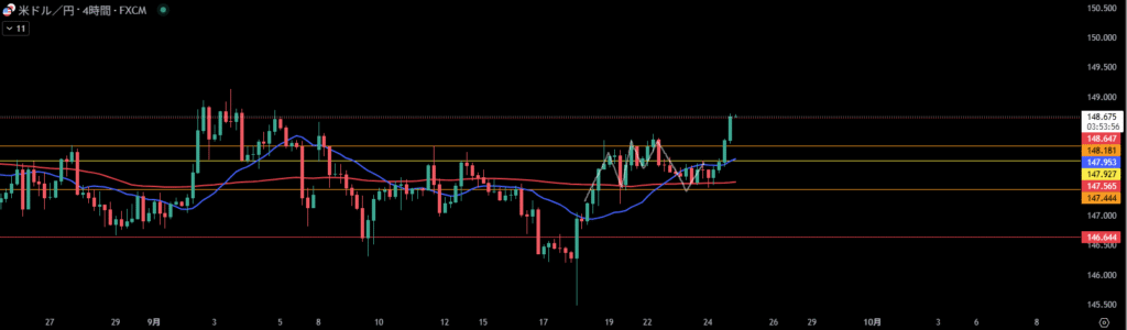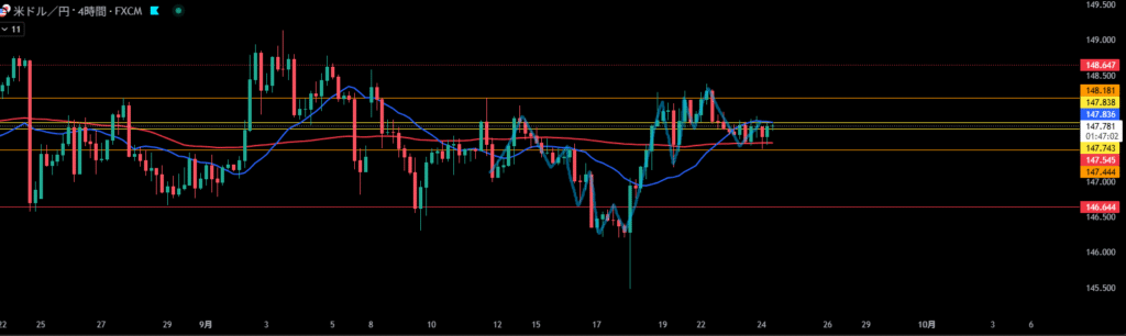 移動平均線は4時間足の買い支えとして機能しやすい。がまだ角度が下向き。