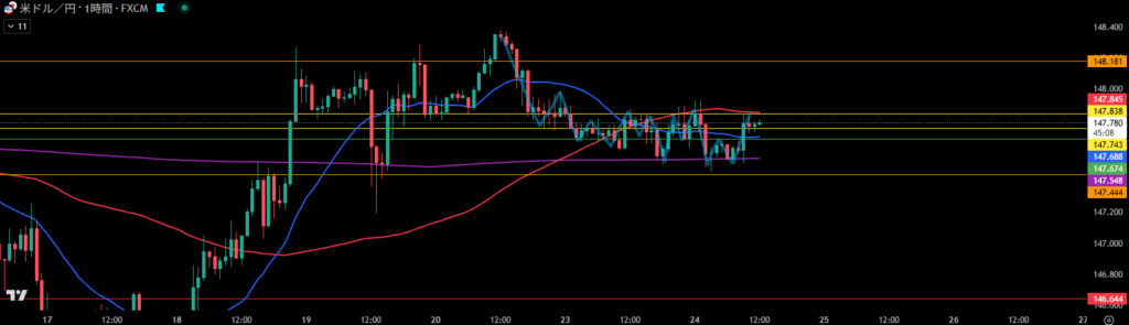 欧州~米国時間に1時間足反転から4時間足戻り売りを検討出来るが、直下には日足MAがあり下髭をつけて何度も反発しているのが1時間足から見えるので、静観し狙わない。
