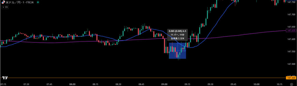 15分足の白矢印の下ヒゲを見た時に、これ15分足抜けてない判定だなって気付きたい。