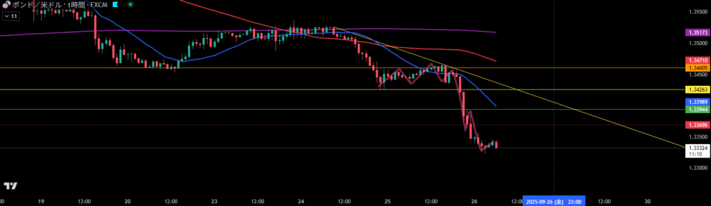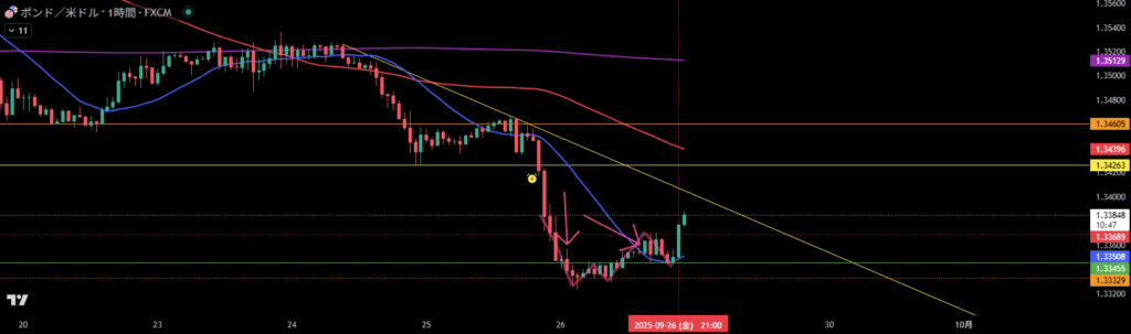 だけど狙っているのは1時間足の波だから、4時間足戻り売りラインまでは行くというイメージを持って、後は5分足ダウで切ろうと決めホールドした。
