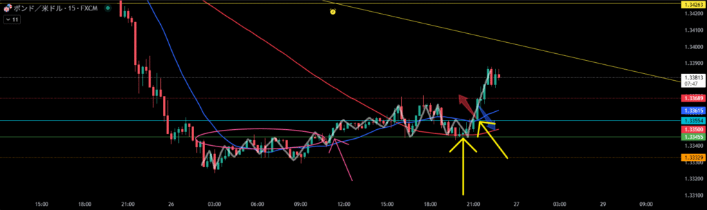 1時間足押し目買いラインは15分足で抑えられていたところを抜けた陽線の起点と見ていた。