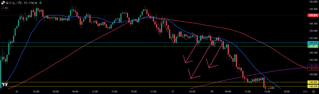 ピンク矢印の15分足注文の集中抜けは9時前だし、仮に9時前にエントリーしても1時間足前回安値付近からエントリーなので入りにくいね。