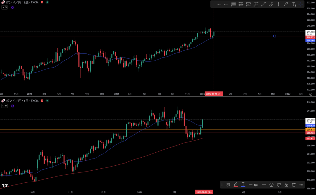 赤線より下に週足のサポート勢力が居る。